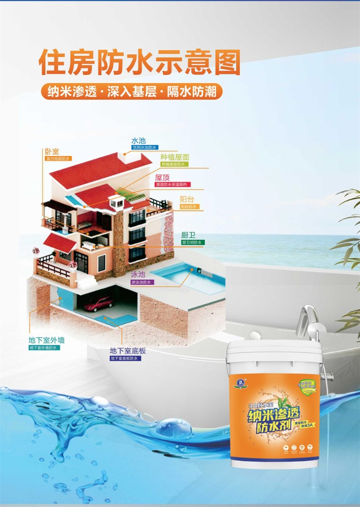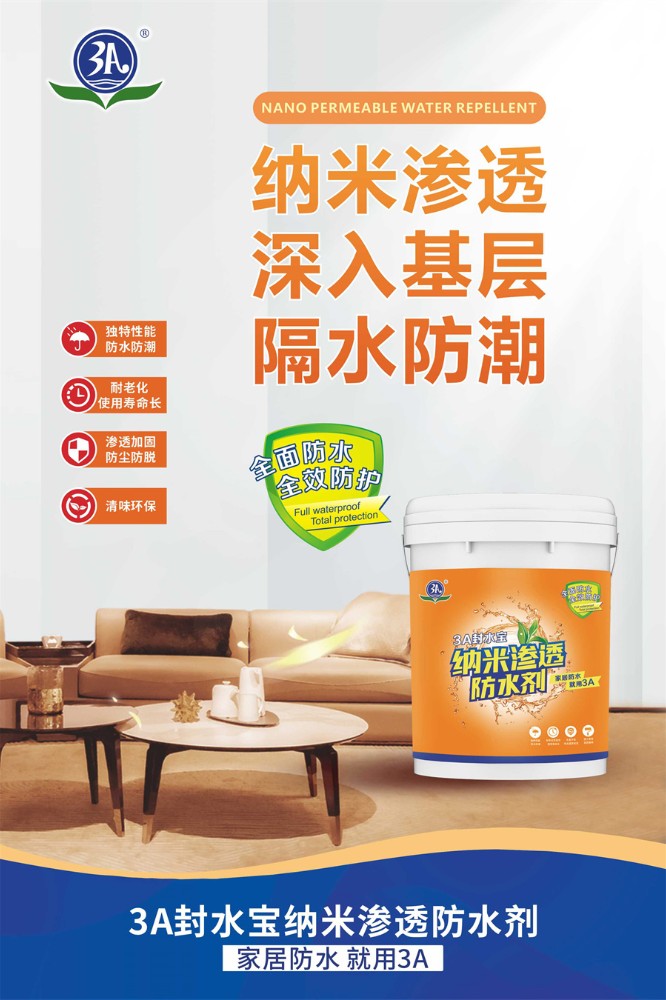 3A封水寶納米滲透防水劑采用專用納米分子合成樹脂乳液經(jīng)過多道工序制作而成,具有良好的耐水防潮、抗堿、耐濕熱和優(yōu)良的抗凍融性,操作簡便,無毒無味。適用于混凝土、加氣混凝土、墻面批刮膩?zhàn)踊蚰ɑ仪盎鶎拥拿軐?shí)(或拉毛)處理;適用于所有的新舊水泥砂漿基面的處理。處理過的墻面和地面,更適合進(jìn)行貼磚、貼墻紙或做木墻板等裝飾。