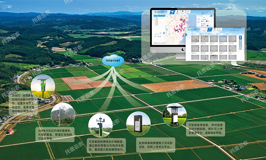 托普云農農作物病蟲害監(jiān)測預警系統(tǒng),由小型氣象站、蟲情測報燈、孢子捕捉儀、苗情/災情攝像機、作物生理生態(tài)監(jiān)測儀以及預警預報系統(tǒng)、專家系統(tǒng)、信息管理平臺、AI智能應用服務組成。