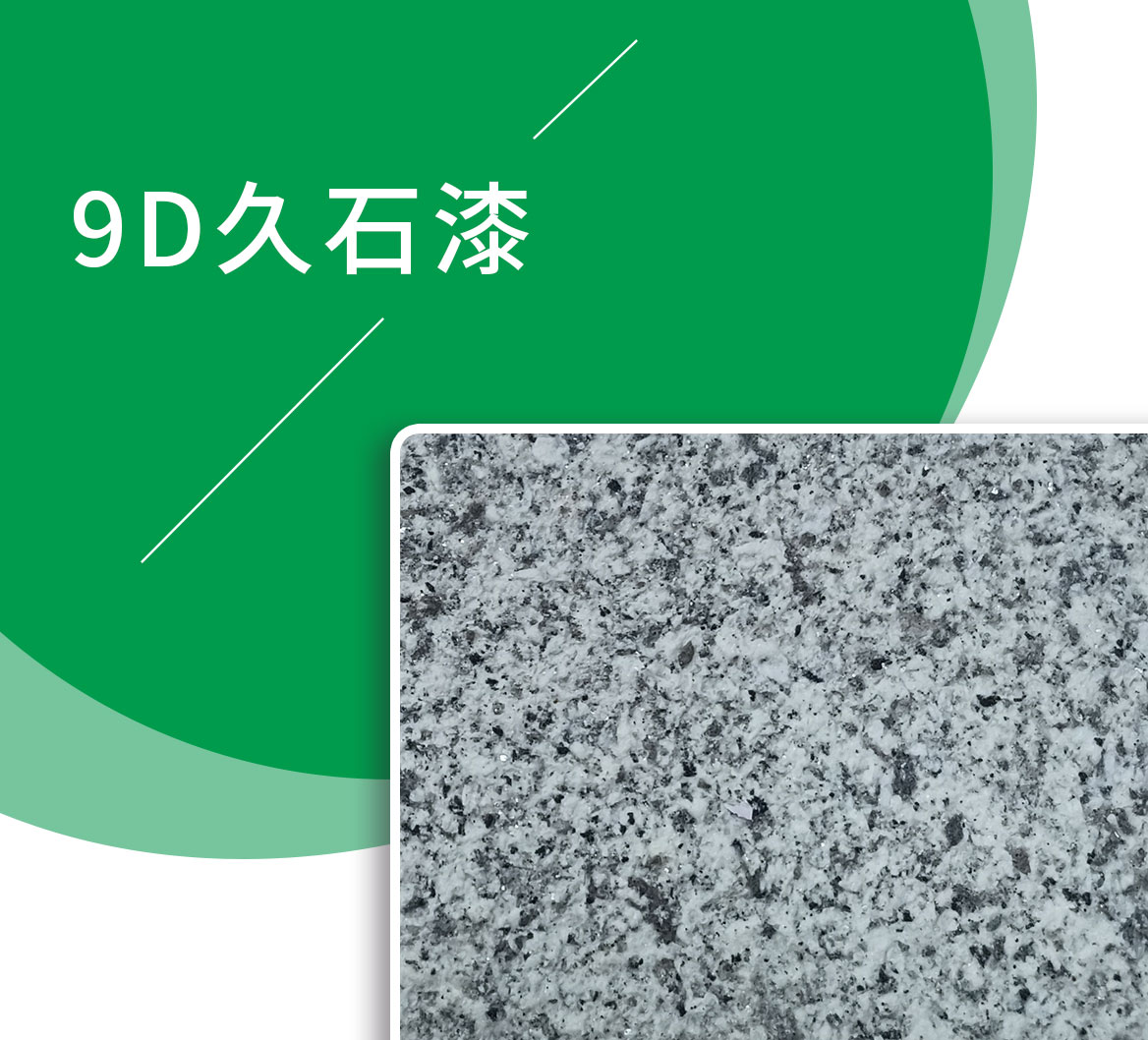 9D久石漆優(yōu)選具有高耐候、超耐污的硅丙乳液為主要成膜物質(zhì),精選顆粒圓潤、質(zhì)地堅硬的石英砂為骨架,搭配水性環(huán)保型功能助劑及色漿等精制而成的水性含砂多彩涂料。該產(chǎn)品擁有自清潔、超耐候、高硬度及優(yōu)異的耐水白等優(yōu)點,對比普通水包砂多彩,其具有更高的仿毛面石材效果,100還原石材仿真度,近乎可以假亂真。久石漆產(chǎn)品不僅可以得到類似荔枝面大理石材的花紋色彩等的裝飾風(fēng)格,同時對墻體有極好的保護(hù)和裝飾效果。